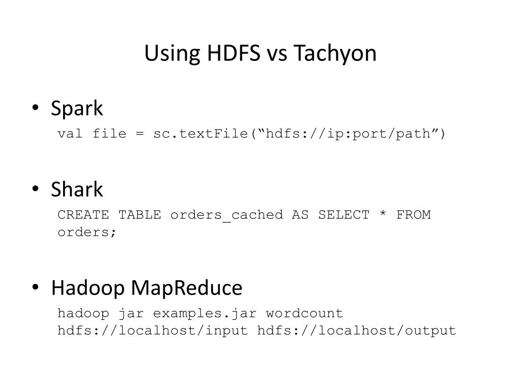 Using HDFS vs Tachyon • Spark valfile = sc.textFile(“hdfs://ip:port/path”) • Shark CREATE TABLE orders_cached AS SELECT * FROM orders; • HadoopMapReduce hadoopjar examples.jarwordcounthdfs://localhost/input hdfs://localhost/output