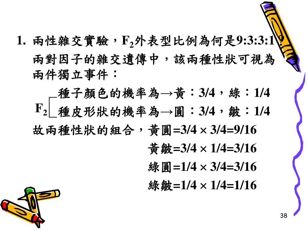 兩性雜交實驗,F2外表型比例為何是9:3:3:1? • 兩對因子的雜交遺傳中,該兩種性狀可視為兩件獨立事件: • 種子顏色的機率為→黃:3/4,綠:1/4 • 種皮形狀的機率為→圓:3/4,皺:1/4 • 故兩種性狀的組合,黃圓=3/4 3/4=9/16 • 黃皺=3/4 1/4=3/16 • 綠圓=1/4 3/4=3/16 • 綠皺=1/4 1/4=1/16 F2
