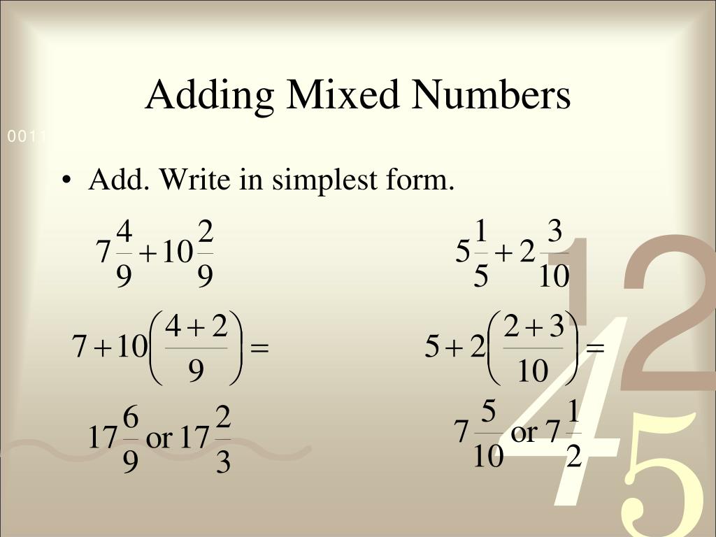 Add & Subtract Mixed Numbers. 7 th Grade Math Lesson Objective: Students will add and subtract mixed numbers. Adding Mixed Numbers. Add. Write in simplest form. Subtracting Mixed Numbers. Subtract. Write in simplest form. Whiteboard Practice. Add or subtract. Write in simplest form.