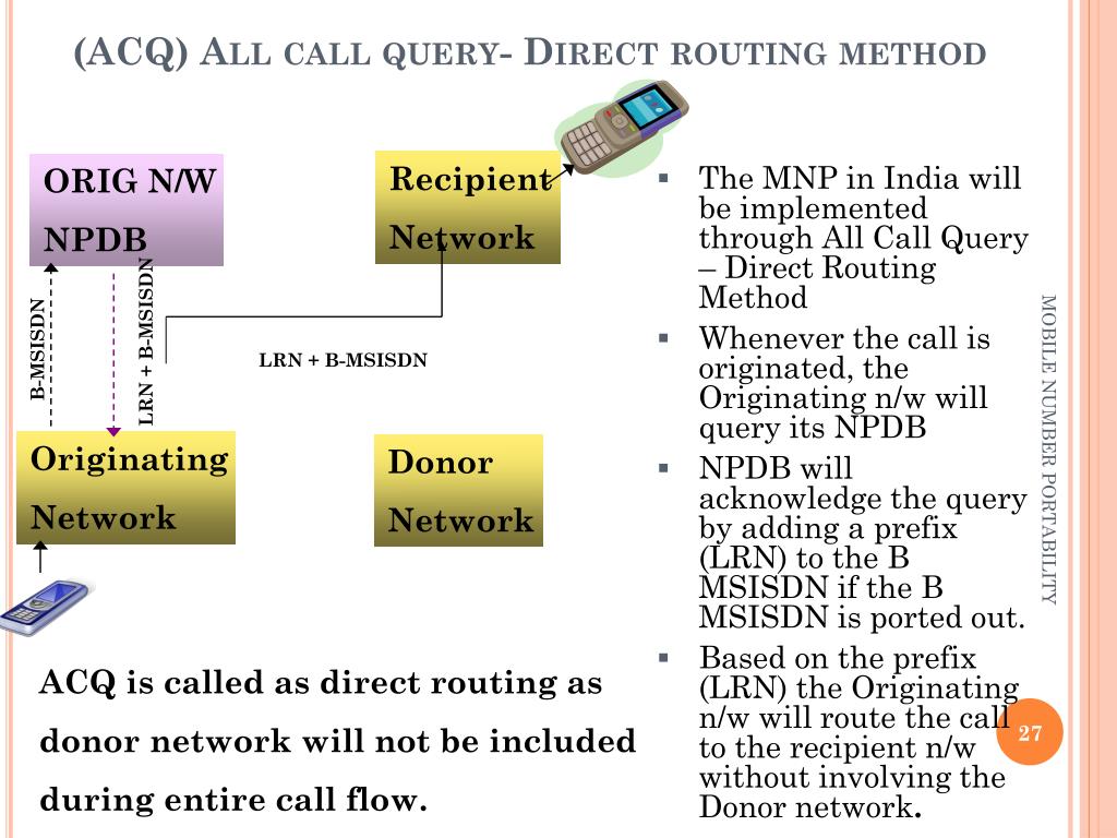 LRN + B-MSISDN LRN + B-MSISDN B-MSISDN (ACQ) All call query- Direct routing method Recipient Network ORIG N/W NPDB • The MNP in India will be implemented through All Call Query – Direct Routing Method • Whenever the call is originated, the Originating n/w will query its NPDB • NPDB will acknowledge the query by adding a prefix (LRN) to the B MSISDN if the B MSISDN is ported out. • Based on the prefix (LRN) the Originating n/w will route the call to the recipient n/w without involving the Donor network. Originating Network Donor Network MOBILE NUMBER PORTABILITY ACQ is called as direct routing as donor network will not be included during entire call flow.