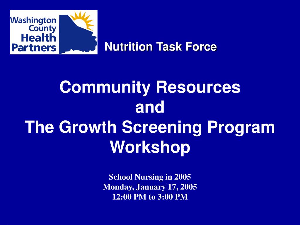 Nutrition Task Force Community Resources and The Growth Screening Program Workshop School Nursing in 2005 Monday, January 17, 2005 12:00 PM to 3:00 PM