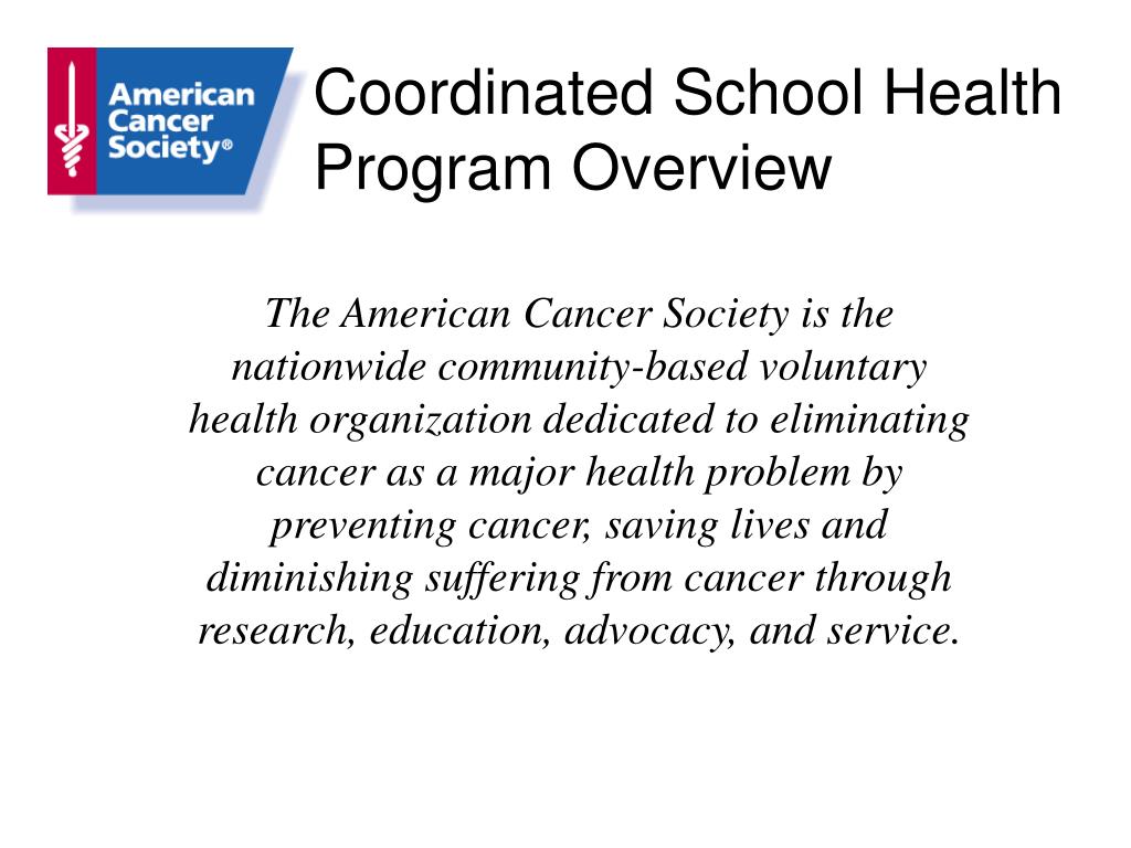 Coordinated School Health Program Overview The American Cancer Society is the nationwide community-based voluntary health organization dedicated to eliminating cancer as a major health problem by preventing cancer, saving lives and diminishing suffering from cancer through research, education, advocacy, and service.