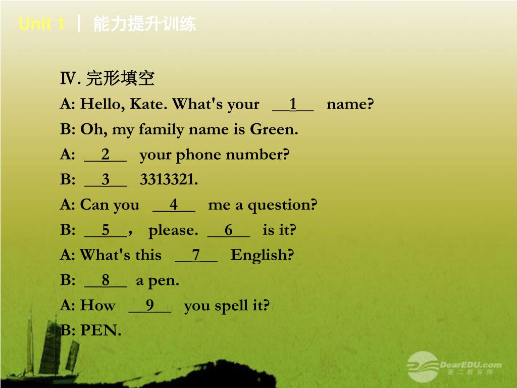 Unit 1 ┃ 能力提升训练 Ⅳ. 完形填空 A: Hello, Kate. What's your __1__ name? B: Oh, my family name is Green. A: __2__ your phone number? B: __3__ 3313321. A: Can you __4__ me a question? B: __5__, please. __6__ is it? A: What's this __7__ English? B: __8__ a pen. A: How __9__ you spell it? B: PEN.