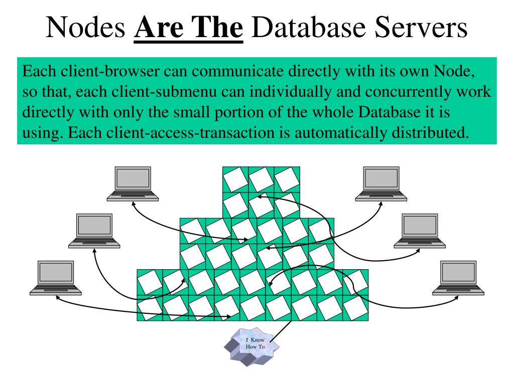 I Know How To Nodes Are The Database Servers Each client-browser can communicate directly with its own Node, so that, each client-submenu can individually and concurrently work directly with only the small portion of the whole Database it is using. Each client-access-transaction is automatically distributed.