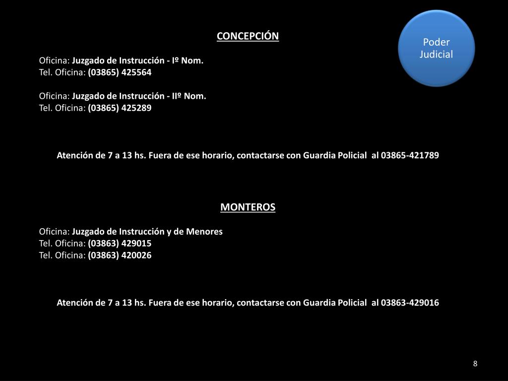 Poder Judicial CONCEPCIÓN Oficina: Juzgado de Instrucción- IºNom. Tel. Oficina: (03865) 425564 Oficina: Juzgado de Instrucción- IIºNom. Tel. Oficina: (03865) 425289 Atención de 7 a 13 hs. Fuera de ese horario, contactarse con Guardia Policial al 03865-421789 MONTEROS Oficina: Juzgado de Instrucción y de MenoresTel. Oficina: (03863) 429015Tel. Oficina: (03863) 420026 Atención de 7 a 13 hs. Fuera de ese horario, contactarse con Guardia Policial al 03863-429016