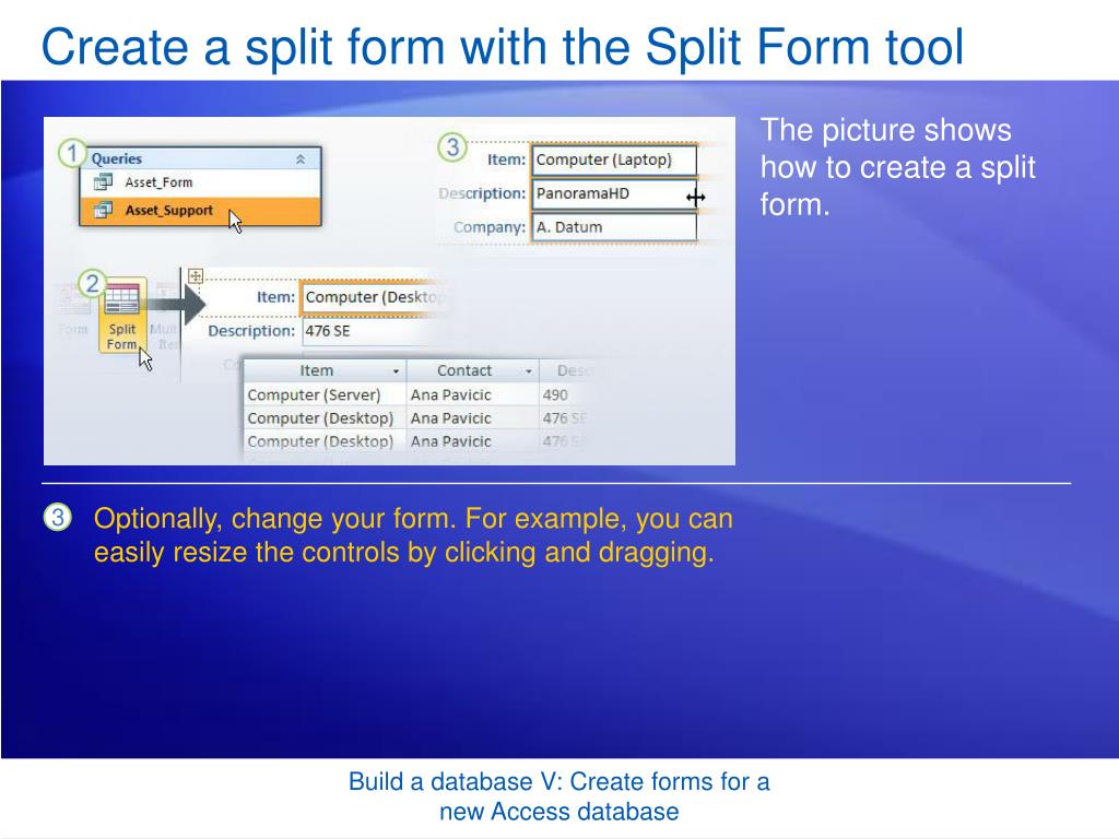 Create a split form with the Split Form tool The picture shows how to create a split form. Optionally, change your form. For example, you can easily resize the controls by clicking and dragging. Build a database V: Create forms for a new Access database