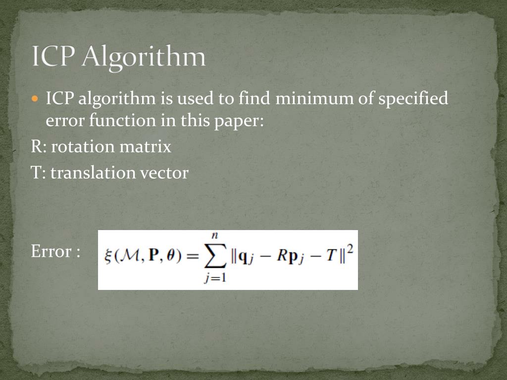 ICP Algorithm • ICP algorithm is used to find minimum of specified error function in this paper: R: rotation matrix T: translation vector Error :