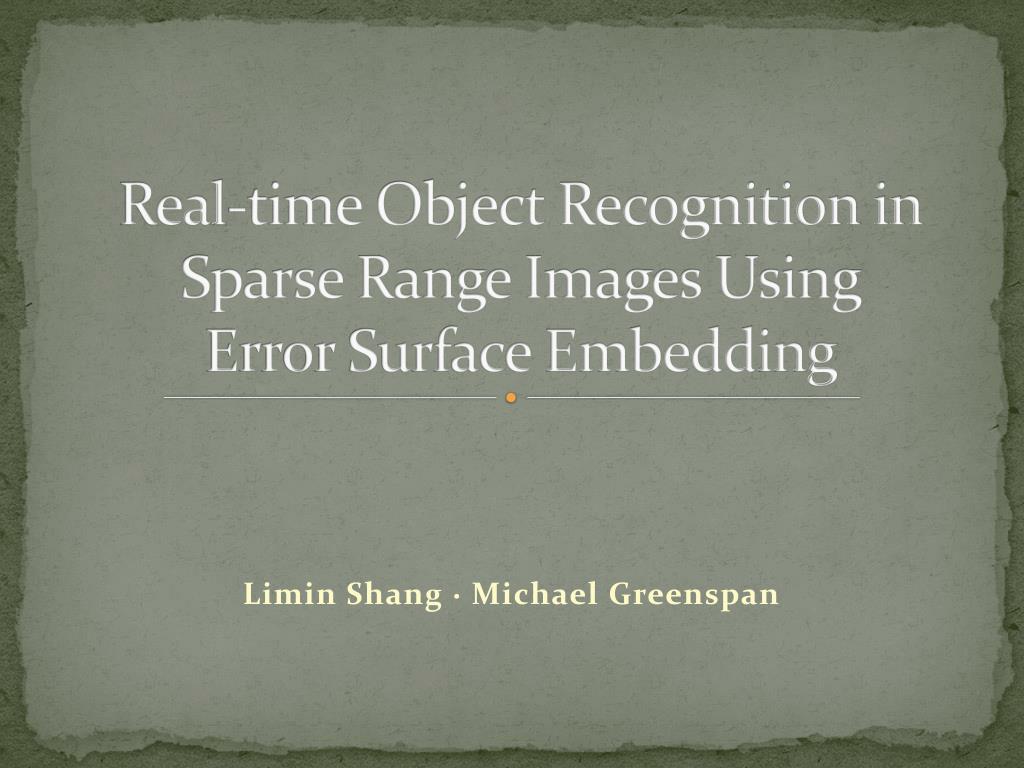 Real-time Object Recognition in Sparse Range Images Using Error Surface Embedding. Limin Shang · Michael Greenspan. Outline. Introduction 3D registration ICP algorithm Creating error surfaces Curvilinear component analysis Reducing storage Embedding Pose determination