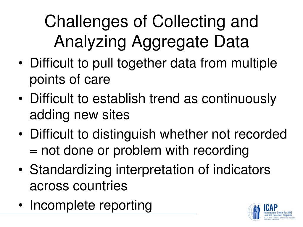 Challenges of Collecting and Analyzing Aggregate Data • Difficult to pull together data from multiple points of care • Difficult to establish trend as continuously adding new sites • Difficult to distinguish whether not recorded = not done or problem with recording • Standardizing interpretation of indicators across countries • Incomplete reporting