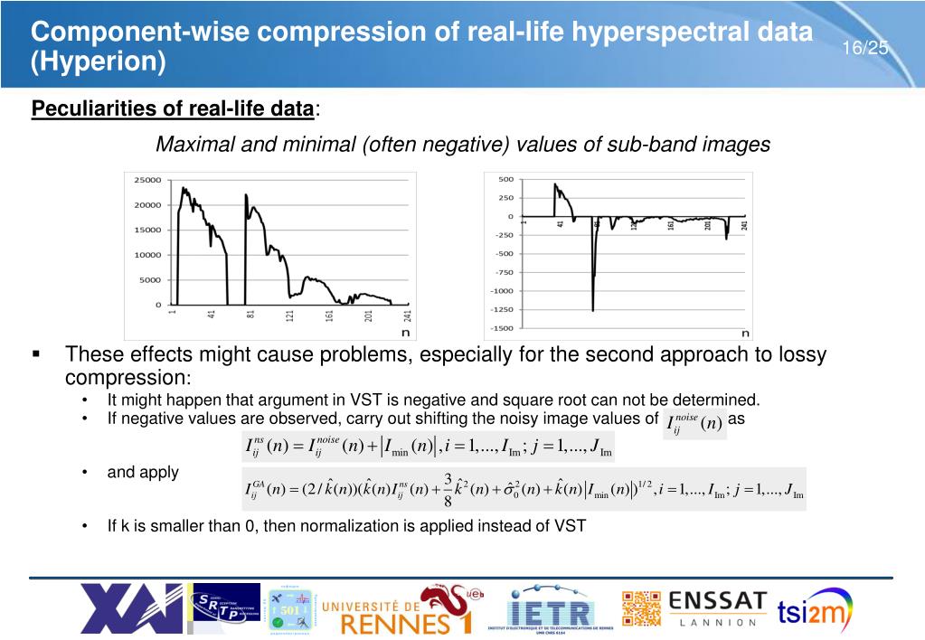 Component-wise compression of real-life hyperspectral data (Hyperion) Peculiarities of real-life data: Maximal and minimal (often negative) values of sub-band images • These effects might cause problems, especially for the second approach to lossy compression: • It might happen that argument in VST is negative and square root can not be determined. • If negative values are observed, carry out shifting the noisy image values of as • and apply • If k is smaller than 0, then normalization is applied instead of VST