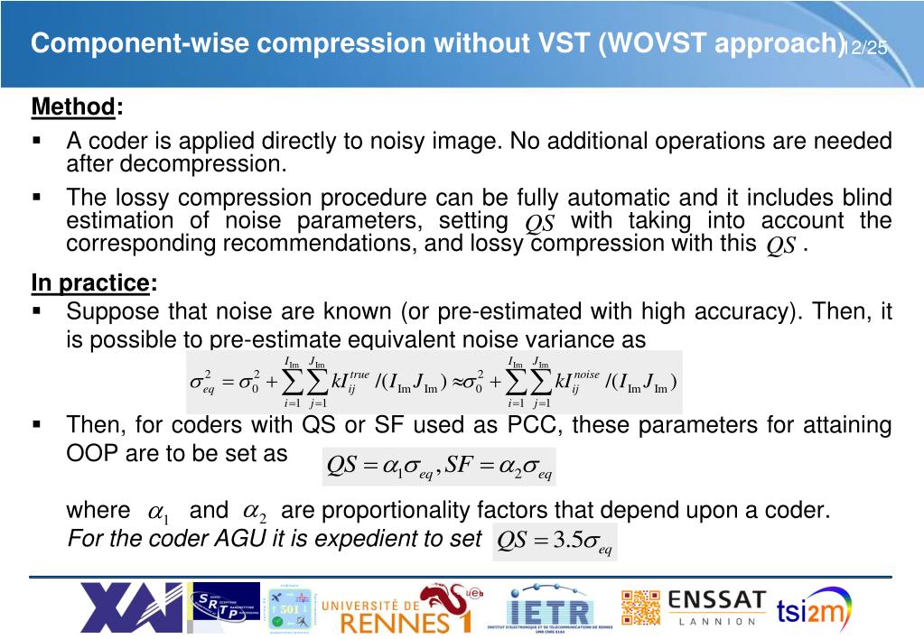 Component-wise compression without VST (WOVST approach) Method: • A coder is applied directly to noisy image. No additional operations are needed after decompression. • The lossy compression procedure can be fully automatic and it includes blind estimation of noise parameters, setting with taking into account the corresponding recommendations, and lossy compression with this . In practice: • Suppose that noise are known (or pre-estimated with high accuracy). Then, it is possible to pre-estimate equivalent noise variance as • Then, for coders with QS or SF used as PCC, these parameters for attaining OOP are to be set as where and are proportionality factors that depend upon a coder. For the coder AGU it is expedient to set