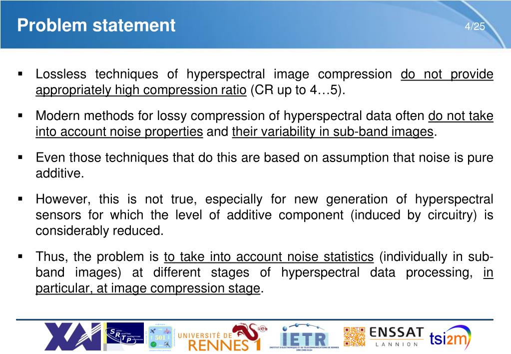 Problem statement • Lossless techniques of hyperspectral image compression do not provide appropriately high compression ratio (CR up to 4…5). • Modern methods for lossy compression of hyperspectral data often do not take into account noise properties and their variability in sub-band images. • Even those techniques that do this are based on assumption that noise is pure additive. • However, this is not true, especially for new generation of hyperspectral sensors for which the level of additive component (induced by circuitry) is considerably reduced. • Thus, the problem is to take into account noise statistics (individually in sub-band images) at different stages of hyperspectral data processing, in particular, at image compression stage.