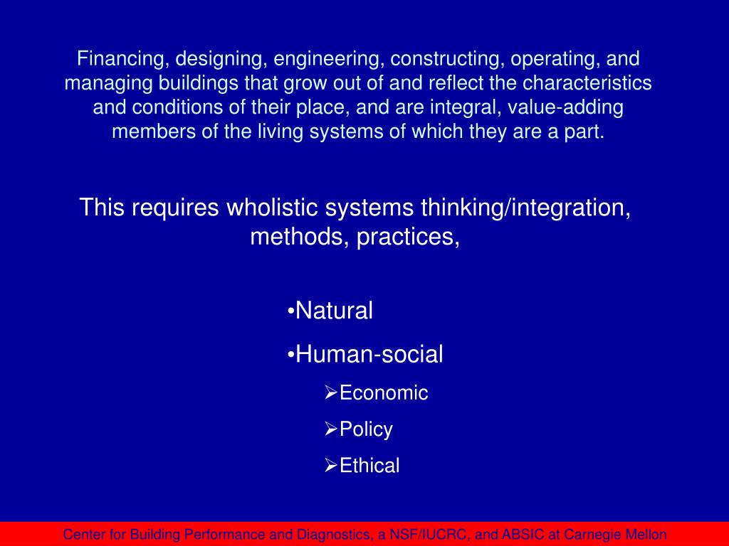 Financing, designing, engineering, constructing, operating, and managing buildings that grow out of and reflect the characteristics and conditions of their place, and are integral, value-adding members of the living systems of which they are a part. This requires wholistic systems thinking/integration, methods, practices, • Natural • Human-social • Economic • Policy • Ethical