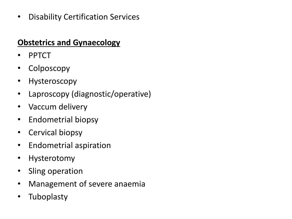 Disability Certification Services Obstetrics and Gynaecology • PPTCT • Colposcopy • Hysteroscopy • Laproscopy (diagnostic/operative) • Vaccum delivery • Endometrial biopsy • Cervical biopsy • Endometrial aspiration • Hysterotomy • Sling operation • Management of severe anaemia • Tuboplasty