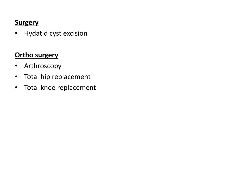 Surgery • Hydatid cyst excision Ortho surgery • Arthroscopy • Total hip replacement • Total knee replacement
