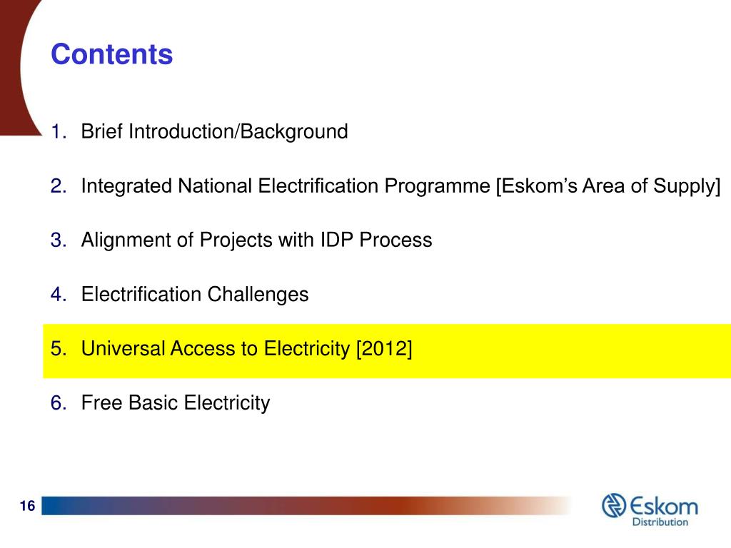 Universal Access Consideration Step-up programme planning to be phased in (+/- 18 Months) Master plan needs to be in place Cost per connection (Based on existing Eskom trends) R4,970 from 2006/7 R5,522 from 2008 to 2010 R6,075 for 2011 to 2012 High cost per connection to be influenced by : Less infrastructure available Catering for higher supply technology e.g. 10A, integrated development programmes Low density/long line length
