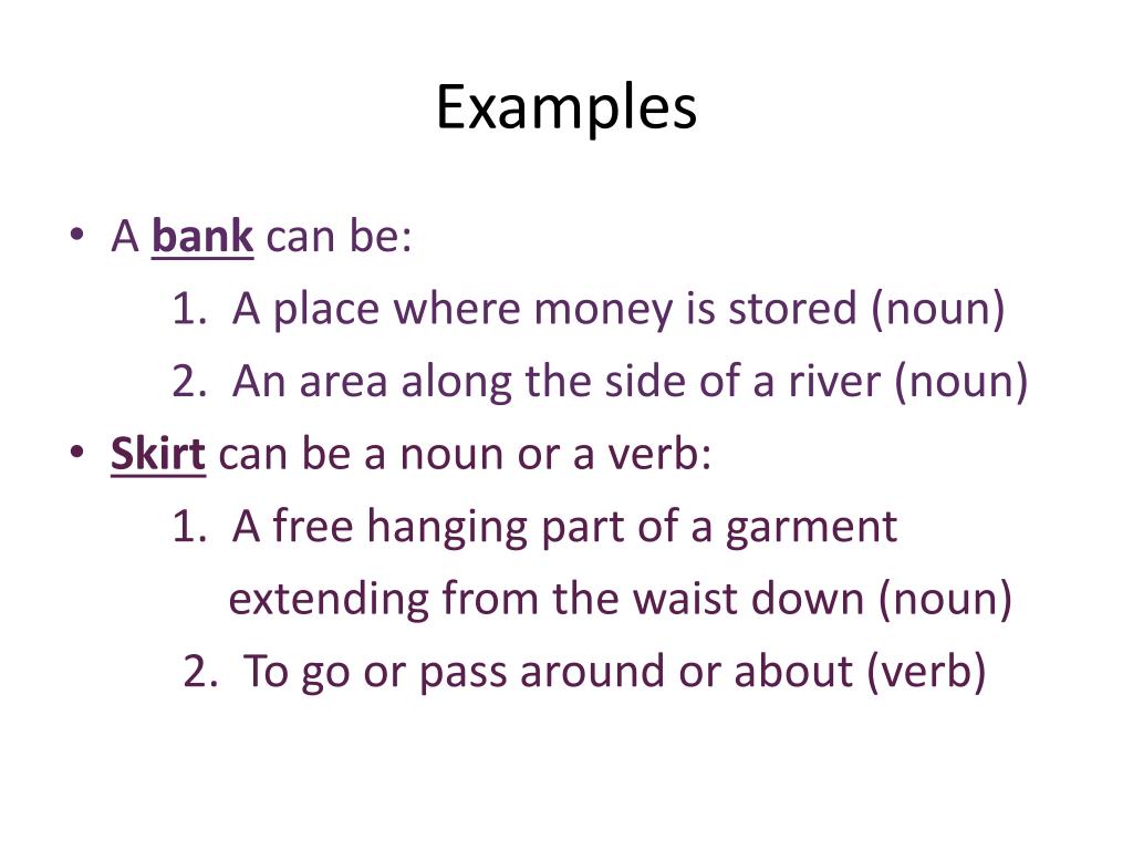 Examples • A bank can be: 1. A place where money is stored (noun) 2. An area along the side of a river (noun) • Skirt can be a noun or a verb: 1. A free hanging part of a garment extending from the waist down (noun) 2. To go or pass around or about (verb)
