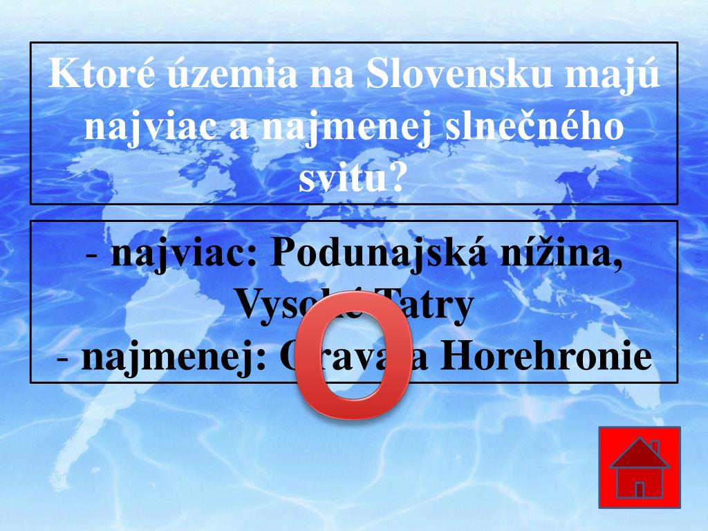 Ktoré územia na Slovensku majú najviac a najmenej slnečného svitu? • najviac: Podunajská nížina, Vysoké Tatry • najmenej: Orava a Horehronie O