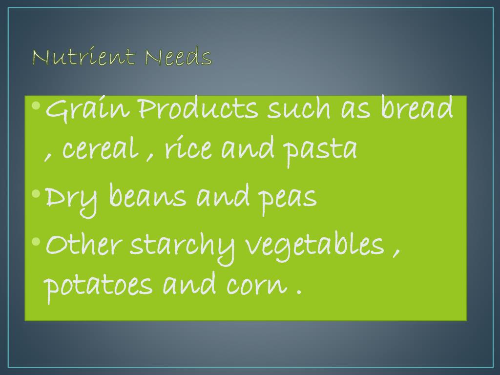 Nutrient Needs • Grain Products such as bread , cereal , rice and pasta • Dry beans and peas • Other starchy vegetables , potatoes and corn .