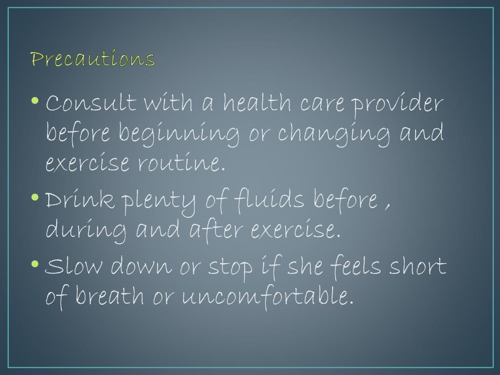 Precautions • Consult with a health care provider before beginning or changing and exercise routine. • Drink plenty of fluids before , during and after exercise. • Slow down or stop if she feels short of breath or uncomfortable.