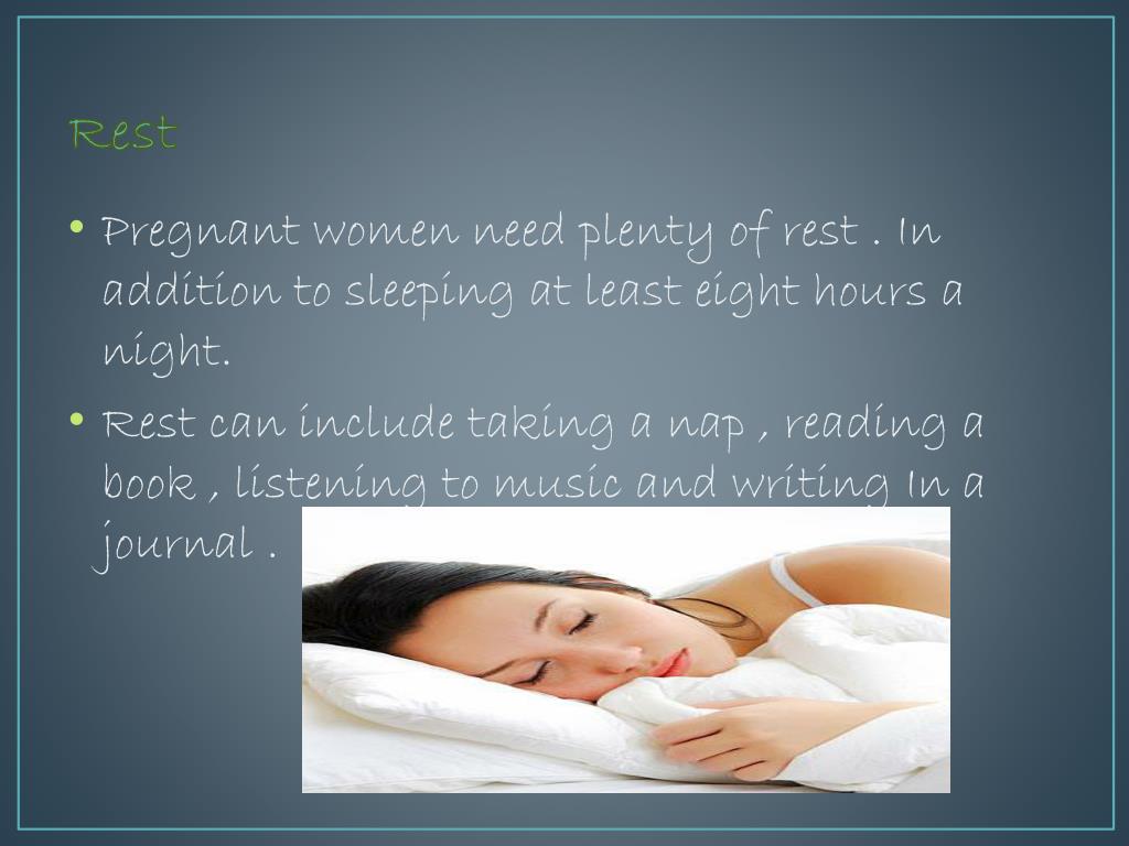 Rest • Pregnant women need plenty of rest . In addition to sleeping at least eight hours a night. • Rest can include taking a nap , reading a book , listening to music and writing In a journal .