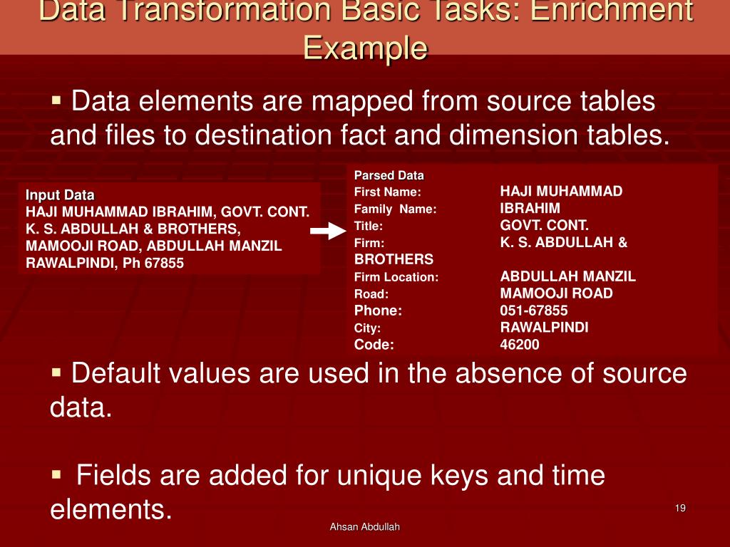 Data Transformation Basic Tasks: Enrichment Example • Data elements are mapped from source tables and files to destination fact and dimension tables. • Default values are used in the absence of source data. • Fields are added for unique keys and time elements. Parsed Data First Name: HAJI MUHAMMAD Family Name: IBRAHIM Title: GOVT. CONT. Firm: K. S. ABDULLAH & BROTHERS Firm Location: ABDULLAH MANZIL Road: MAMOOJI ROAD Phone: 051-67855 City: RAWALPINDI Code: 46200 Input Data HAJI MUHAMMAD IBRAHIM, GOVT. CONT. K. S. ABDULLAH & BROTHERS, MAMOOJI ROAD, ABDULLAH MANZIL RAWALPINDI, Ph 67855 Ahsan Abdullah