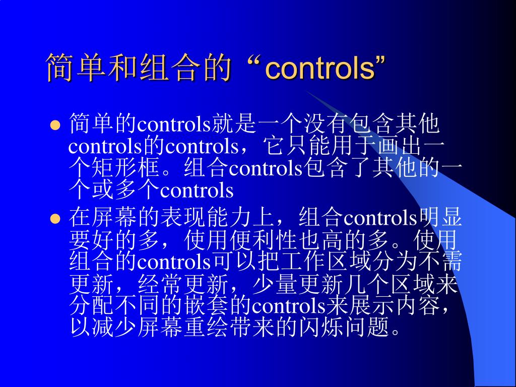 简单和组合的“controls” • 简单的controls就是一个没有包含其他controls的controls,它只能用于画出一个矩形框。组合controls包含了其他的一个或多个controls • 在屏幕的表现能力上,组合controls明显要好的多,使用便利性也高的多。使用组合的controls可以把工作区域分为不需更新,经常更新,少量更新几个区域来分配不同的嵌套的controls来展示内容,以减少屏幕重绘带来的闪烁问题。