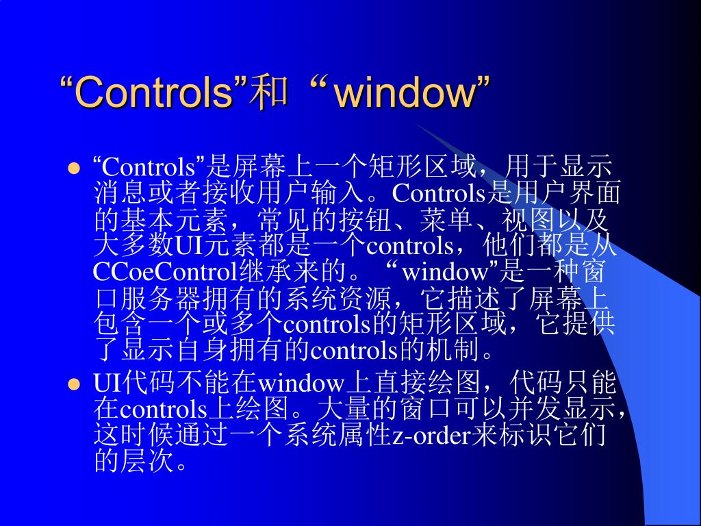 “Controls”和“window” • “Controls”是屏幕上一个矩形区域,用于显示消息或者接收用户输入。Controls是用户界面的基本元素,常见的按钮、菜单、视图以及大多数UI元素都是一个controls,他们都是从CCoeControl继承来的。“window”是一种窗口服务器拥有的系统资源,它描述了屏幕上包含一个或多个controls的矩形区域,它提供了显示自身拥有的controls的机制。 • UI代码不能在window上直接绘图,代码只能在controls上绘图。大量的窗口可以并发显示,这时候通过一个系统属性z-order来标识它们的层次。