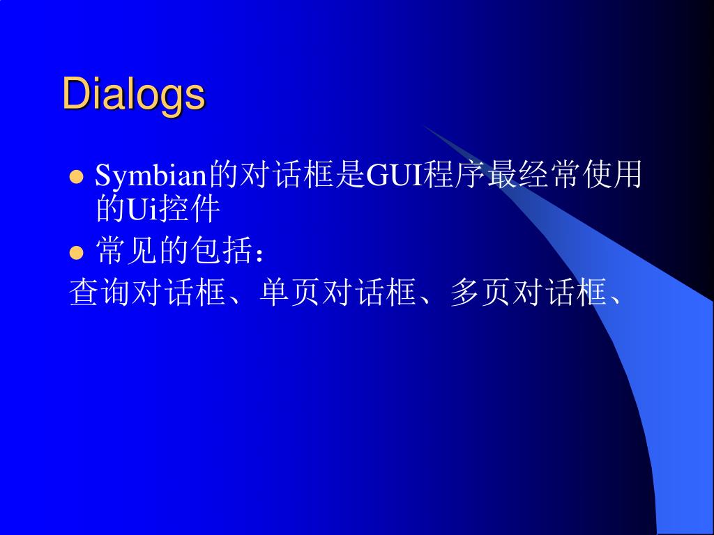 Dialogs • Symbian的对话框是GUI程序最经常使用的Ui控件 • 常见的包括: 查询对话框、单页对话框、多页对话框、