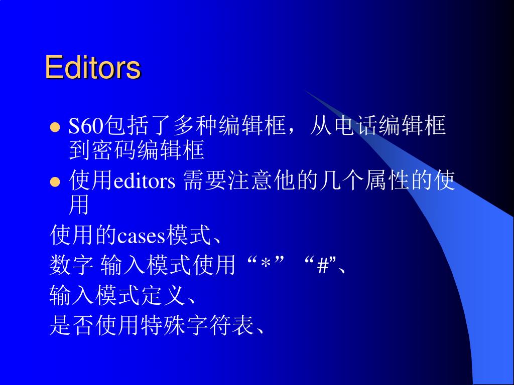 Editors • S60包括了多种编辑框,从电话编辑框到密码编辑框 • 使用editors 需要注意他的几个属性的使用 使用的cases模式、 数字 输入模式使用“*”“#”、 输入模式定义、 是否使用特殊字符表、