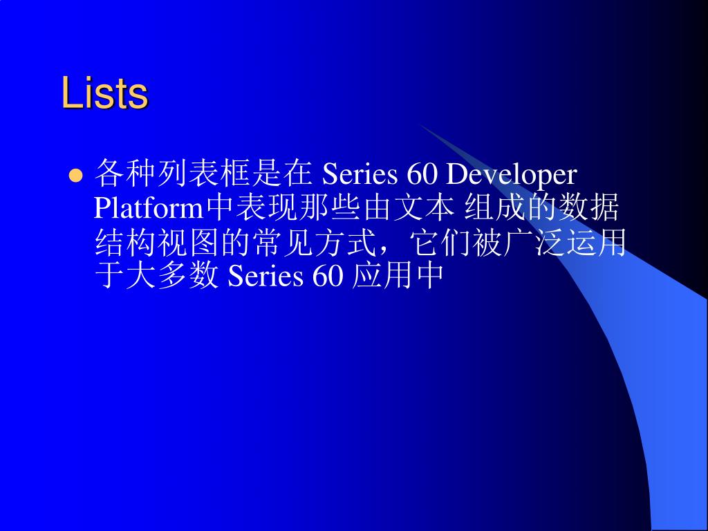 Lists • 各种列表框是在 Series 60 Developer Platform中表现那些由文本 组成的数据结构视图的常见方式,它们被广泛运用于大多数 Series 60 应用中