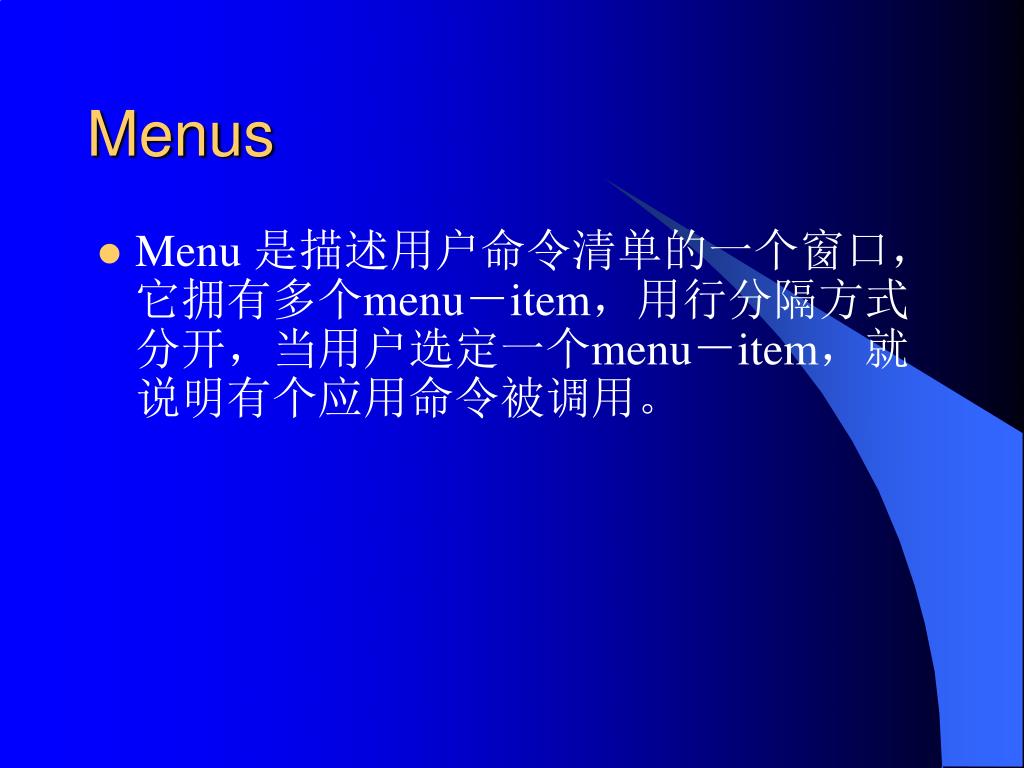 Menus • Menu 是描述用户命令清单的一个窗口,它拥有多个menu-item,用行分隔方式分开,当用户选定一个menu-item,就说明有个应用命令被调用。
