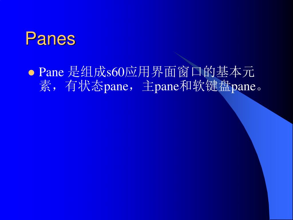 Panes • Pane 是组成s60应用界面窗口的基本元素,有状态pane,主pane和软键盘pane。