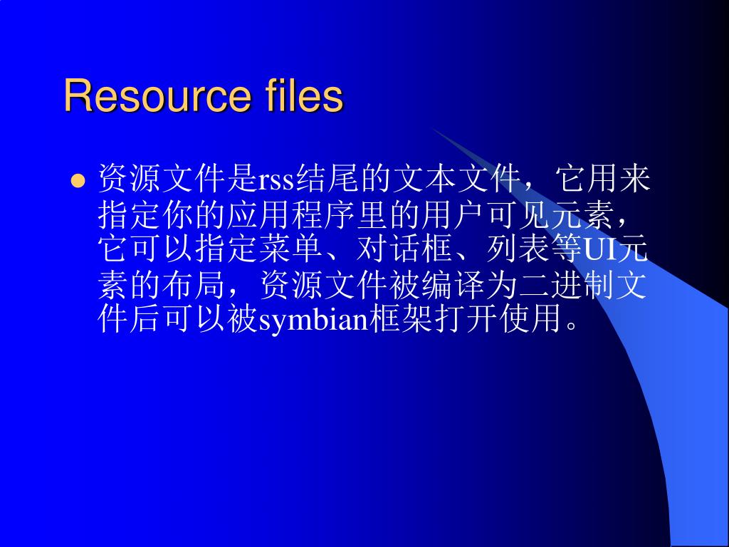 Resource files • 资源文件是rss结尾的文本文件,它用来指定你的应用程序里的用户可见元素,它可以指定菜单、对话框、列表等UI元素的布局,资源文件被编译为二进制文件后可以被symbian框架打开使用。