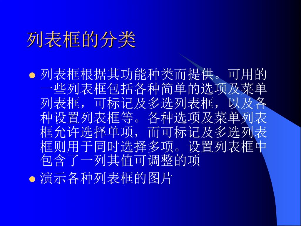 列表框的分类 • 列表框根据其功能种类而提供。可用的一些列表框包括各种简单的选项及菜单列表框,可标记及多选列表框,以及各种设置列表框等。各种选项及菜单列表框允许选择单项,而可标记及多选列表框则用于同时选择多项。设置列表框中包含了一列其值可调整的项 • 演示各种列表框的图片