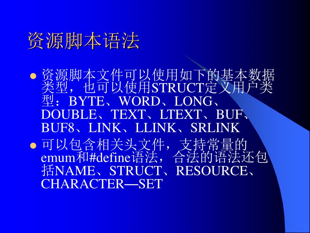 资源脚本语法 • 资源脚本文件可以使用如下的基本数据类型,也可以使用STRUCT定义用户类型:BYTE、WORD、LONG、DOUBLE、TEXT、LTEXT、BUF、BUF8、LINK、LLINK、SRLINK • 可以包含相关头文件,支持常量的emum和#define语法,合法的语法还包括NAME、STRUCT、RESOURCE、CHARACTER—SET