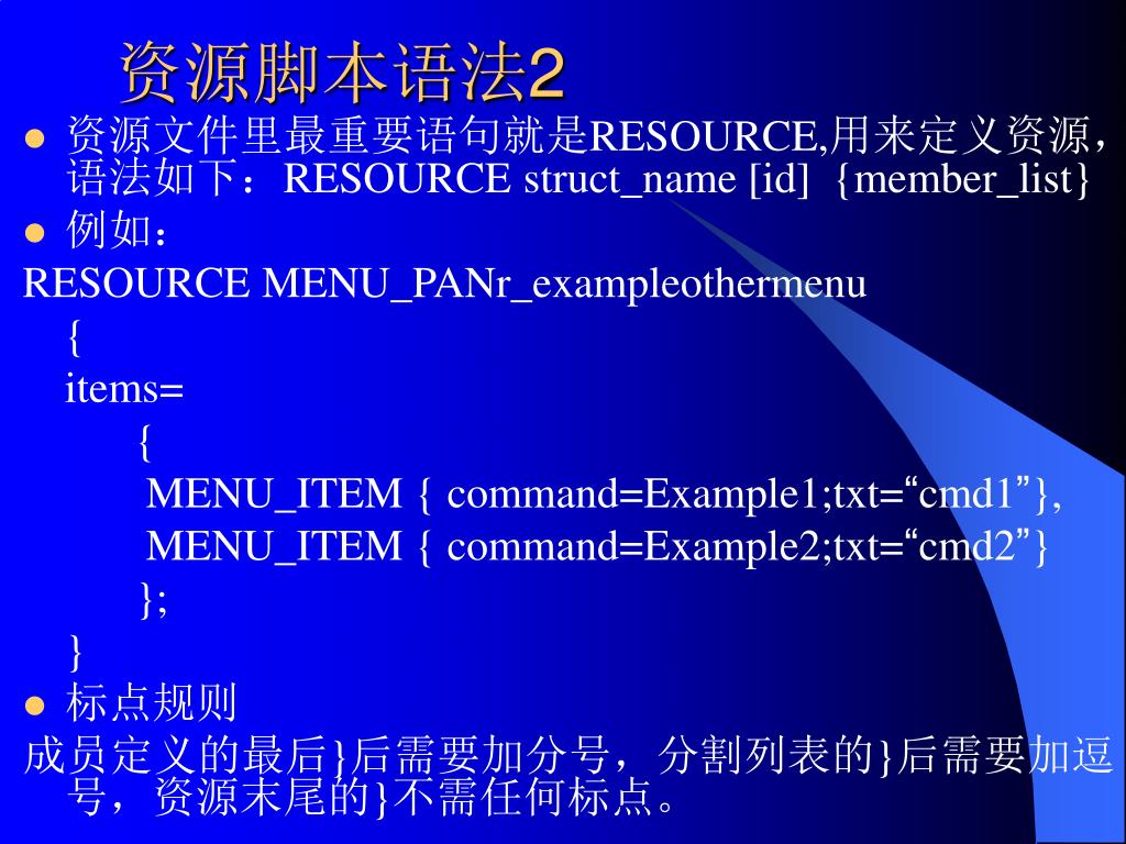 资源脚本语法2 • 资源文件里最重要语句就是RESOURCE,用来定义资源,语法如下:RESOURCE struct_name [id] {member_list} • 例如: RESOURCE MENU_PANr_exampleothermenu { items= { MENU_ITEM { command=Example1;txt=“cmd1”}, MENU_ITEM { command=Example2;txt=“cmd2”} }; } • 标点规则 成员定义的最后}后需要加分号,分割列表的}后需要加逗号,资源末尾的}不需任何标点。