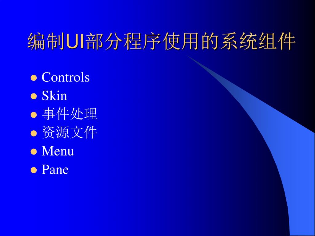 编制UI部分程序使用的系统组件 • Controls • Skin • 事件处理 • 资源文件 • Menu • Pane
