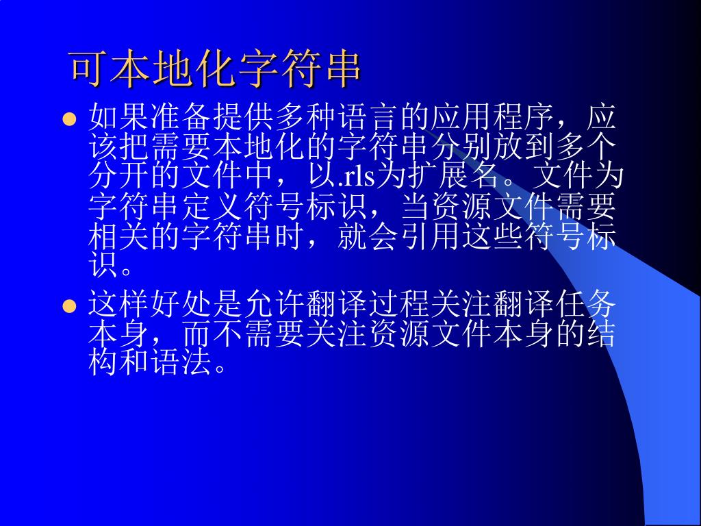 可本地化字符串 • 如果准备提供多种语言的应用程序,应该把需要本地化的字符串分别放到多个分开的文件中,以.rls为扩展名。文件为字符串定义符号标识,当资源文件需要相关的字符串时,就会引用这些符号标识。 • 这样好处是允许翻译过程关注翻译任务本身,而不需要关注资源文件本身的结构和语法。