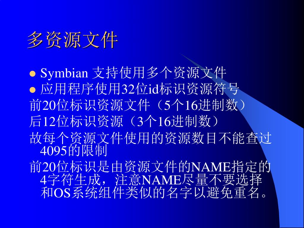 多资源文件 • Symbian 支持使用多个资源文件 • 应用程序使用32位id标识资源符号 前20位标识资源文件(5个16进制数) 后12位标识资源(3个16进制数) 故每个资源文件使用的资源数目不能查过4095的限制 前20位标识是由资源文件的NAME指定的4字符生成,注意NAME尽量不要选择和OS系统组件类似的名字以避免重名。