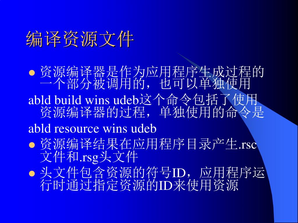 编译资源文件 • 资源编译器是作为应用程序生成过程的一个部分被调用的,也可以单独使用 abld build wins udeb这个命令包括了使用资源编译器的过程,单独使用的命令是 abld resource wins udeb • 资源编译结果在应用程序目录产生.rsc文件和.rsg头文件 • 头文件包含资源的符号ID,应用程序运行时通过指定资源的ID来使用资源