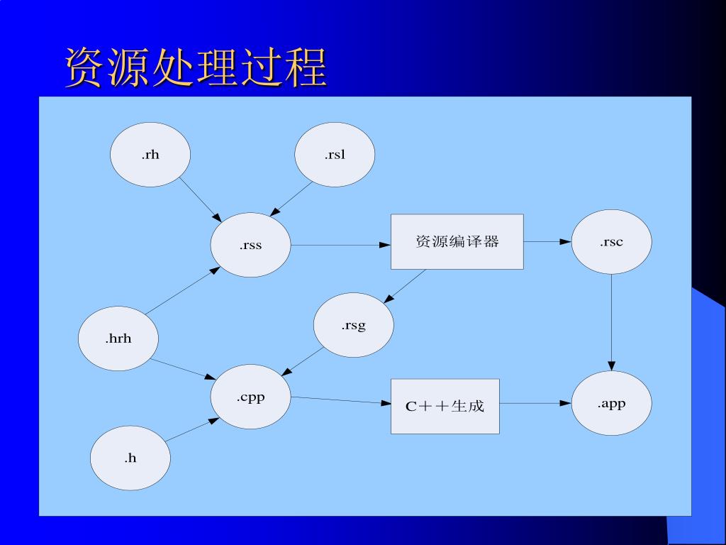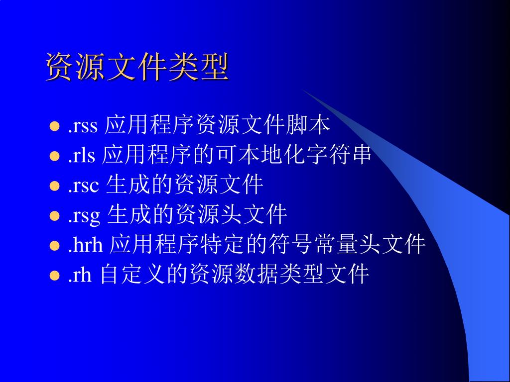 资源文件类型 • .rss 应用程序资源文件脚本 • .rls 应用程序的可本地化字符串 • .rsc 生成的资源文件 • .rsg 生成的资源头文件 • .hrh 应用程序特定的符号常量头文件 • .rh 自定义的资源数据类型文件