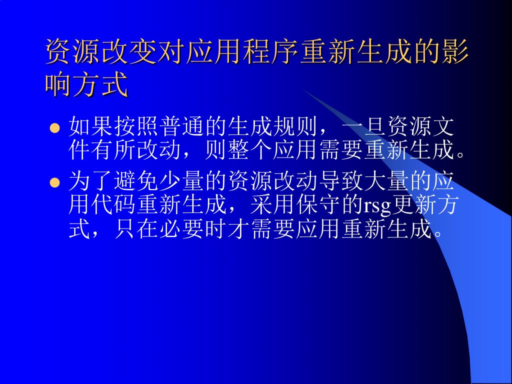 资源改变对应用程序重新生成的影响方式 • 如果按照普通的生成规则,一旦资源文件有所改动,则整个应用需要重新生成。 • 为了避免少量的资源改动导致大量的应用代码重新生成,采用保守的rsg更新方式,只在必要时才需要应用重新生成。