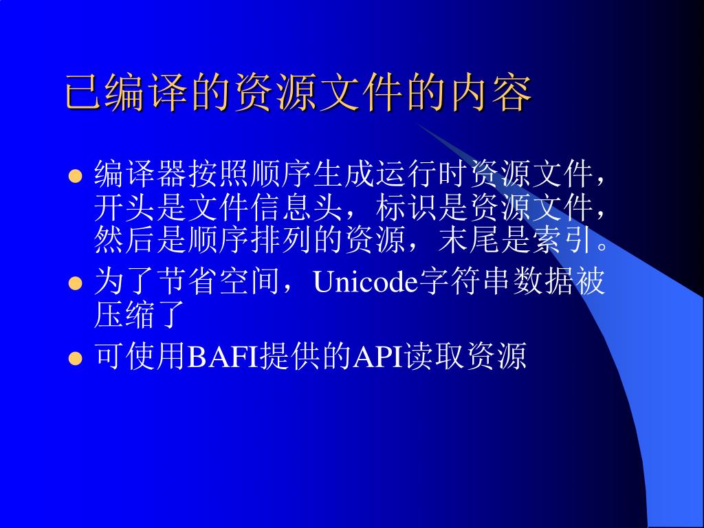 已编译的资源文件的内容 • 编译器按照顺序生成运行时资源文件,开头是文件信息头,标识是资源文件,然后是顺序排列的资源,末尾是索引。 • 为了节省空间,Unicode字符串数据被压缩了 • 可使用BAFI提供的API读取资源