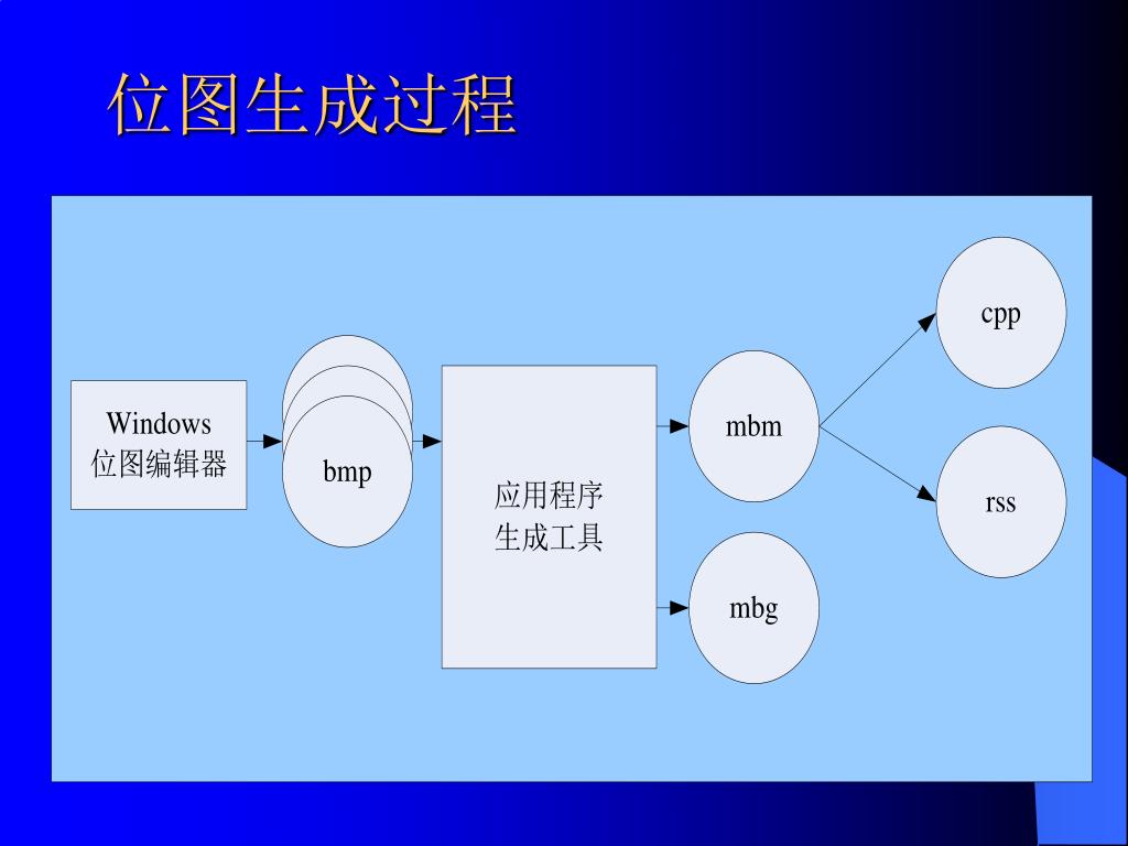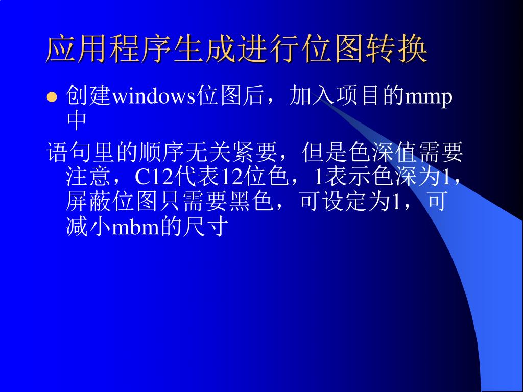 应用程序生成进行位图转换 • 创建windows位图后,加入项目的mmp中 语句里的顺序无关紧要,但是色深值需要注意,C12代表12位色,1表示色深为1,屏蔽位图只需要黑色,可设定为1,可减小mbm的尺寸