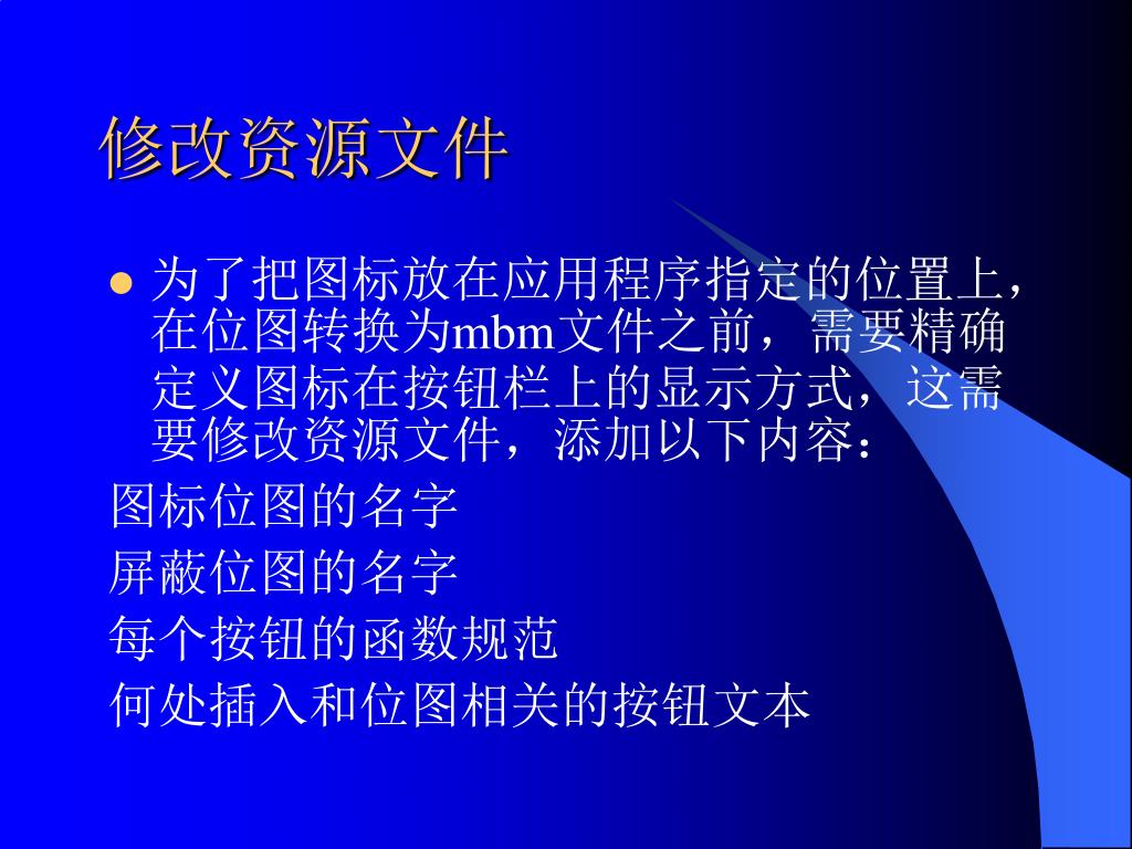 修改资源文件 • 为了把图标放在应用程序指定的位置上,在位图转换为mbm文件之前,需要精确定义图标在按钮栏上的显示方式,这需要修改资源文件,添加以下内容: 图标位图的名字 屏蔽位图的名字 每个按钮的函数规范 何处插入和位图相关的按钮文本
