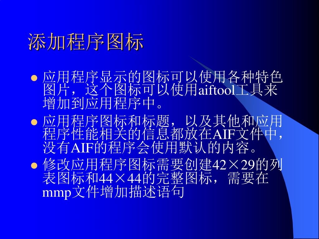 添加程序图标 • 应用程序显示的图标可以使用各种特色图片,这个图标可以使用aiftool工具来增加到应用程序中。 • 应用程序图标和标题,以及其他和应用程序性能相关的信息都放在AIF文件中,没有AIF的程序会使用默认的内容。 • 修改应用程序图标需要创建42×29的列表图标和44×44的完整图标,需要在mmp文件增加描述语句