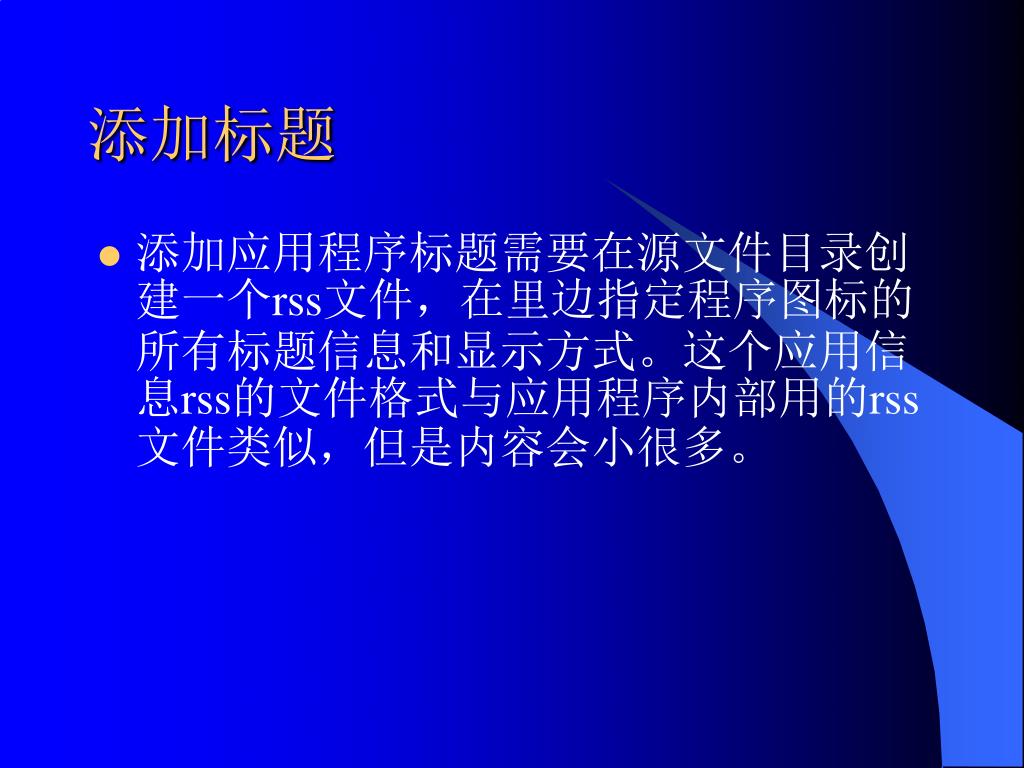 添加标题 • 添加应用程序标题需要在源文件目录创建一个rss文件,在里边指定程序图标的所有标题信息和显示方式。这个应用信息rss的文件格式与应用程序内部用的rss文件类似,但是内容会小很多。