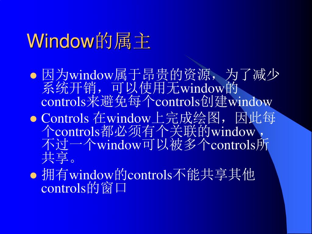 Window的属主 • 因为window属于昂贵的资源,为了减少系统开销,可以使用无window的controls来避免每个controls创建window • Controls 在window上完成绘图,因此每个controls都必须有个关联的window ,不过一个window可以被多个controls所共享。 • 拥有window的controls不能共享其他controls的窗口