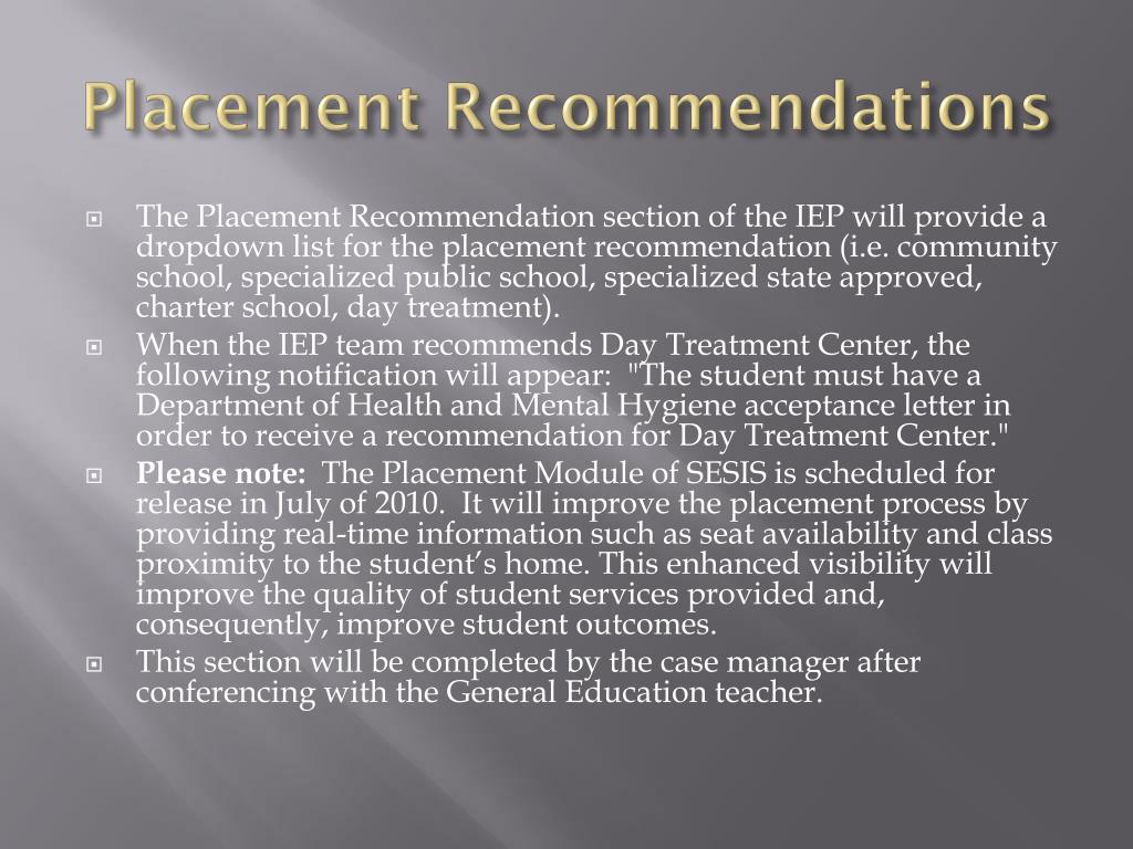 Placement Recommendations • The Placement Recommendation section of the IEP will provide a dropdown list for the placement recommendation (i.e. community school, specialized public school, specialized state approved, charter school, day treatment). • When the IEP team recommends Day Treatment Center, the following notification will appear: "The student must have a Department of Health and Mental Hygiene acceptance letter in order to receive a recommendation for Day Treatment Center." • Please note: The Placement Module of SESIS is scheduled for release in July of 2010. It will improve the placement process by providing real-time information such as seat availability and class proximity to the student’s home. This enhanced visibility will improve the quality of student services provided and, consequently, improve student outcomes. • This section will be completed by the case manager after conferencing with the General Education teacher.